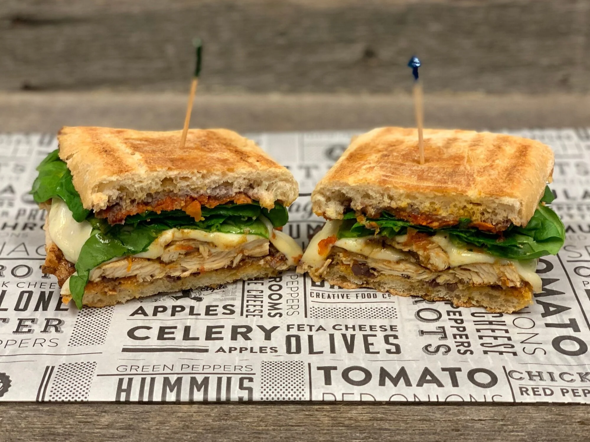 ciabatta, chicken breast, melted provolone, spinach, black olive tapenade, sundried tomato pesto